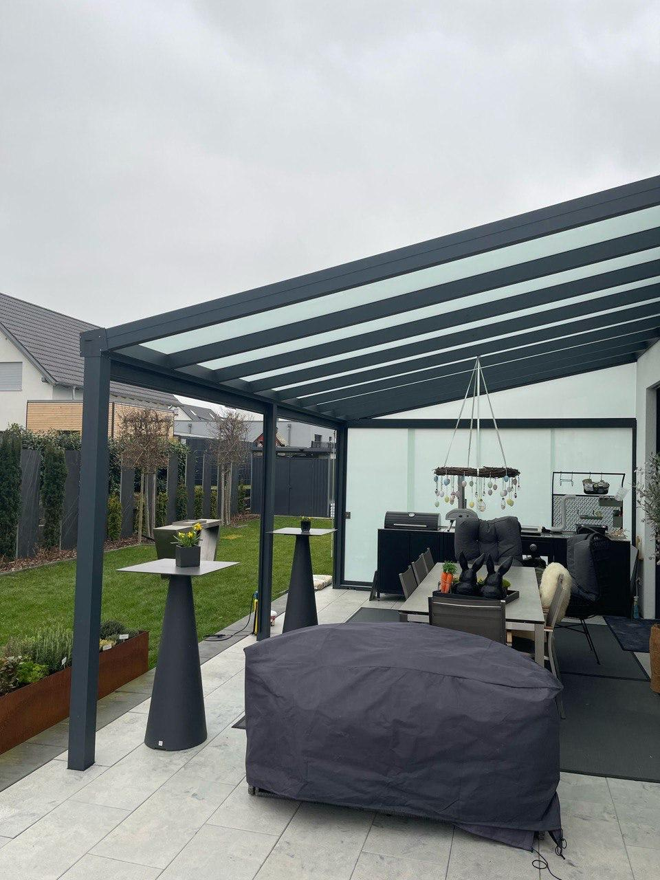 Unsere Aluminium-Terrassenüberdachung bietet ganzjährigen Komfort und ein modernes Design. Sie schützt zuverlässig vor Regen, Schnee und Sonne, sodass Ihre Terrasse zu jeder Jahreszeit nutzbar bleibt. Das 8 mm starke Sicherheitsglas sorgt für klare Sicht und ein helles, offenes Raumgefühl, während die integrierte LED-Beleuchtung für stimmungsvolles Licht am Abend sorgt. Die hochwertige, pulverbeschichtete Aluminiumkonstruktion in Anthrazit (DB 703s) ist pflegeleicht, witterungsbeständig und äußerst langlebig. Perfekt geeignet für Familien, die Funktionalität, Ästhetik und Qualität vereinen möchten. Optional erweiterbar mit Seitenelementen oder Markisen – für maximalen Komfort im Außenbereich.